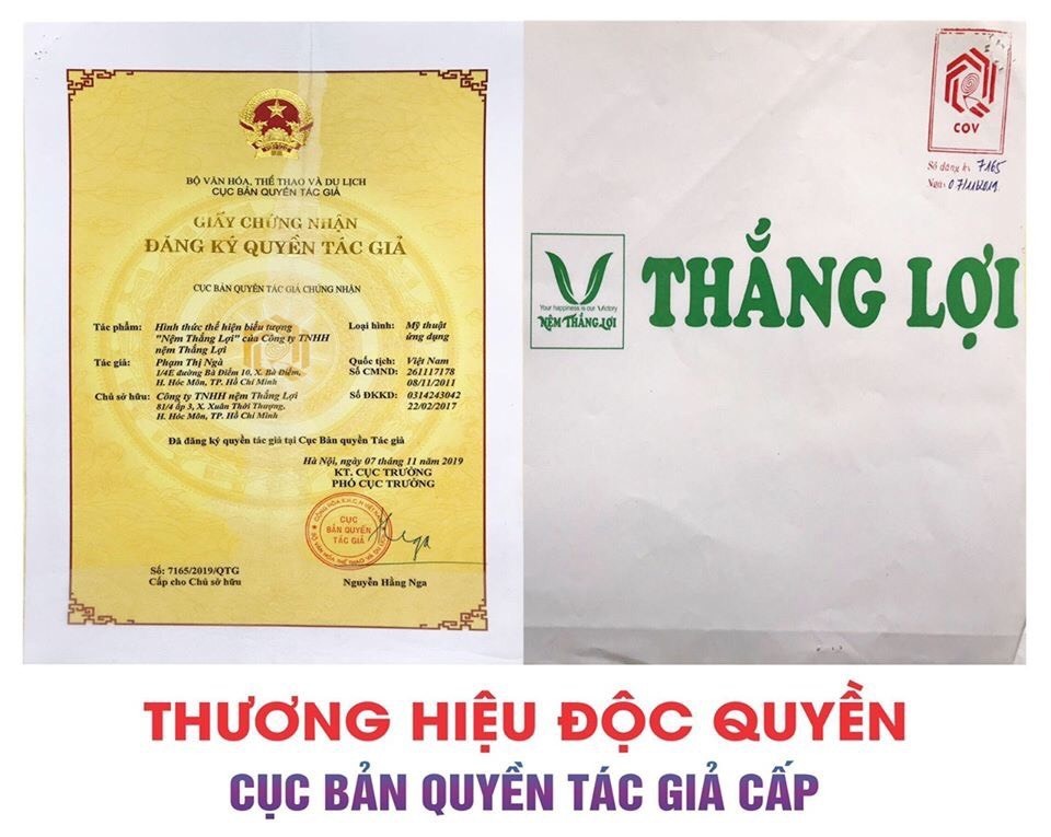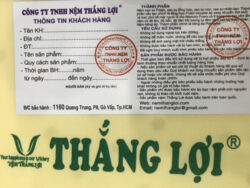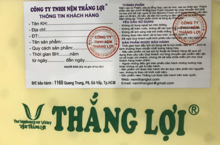 Hiện nay xuất hiện rất nhiều cơ sở sản xuất Nệm Thắng Lợi giả, kém chất lượng, khi chọn nệm bạn bên nhìn quanh bao bì ni lông 4 góc nệm sẽ có thông tin: Công Ty TNHH Nệm Thắng Lợi và Logo của hãng